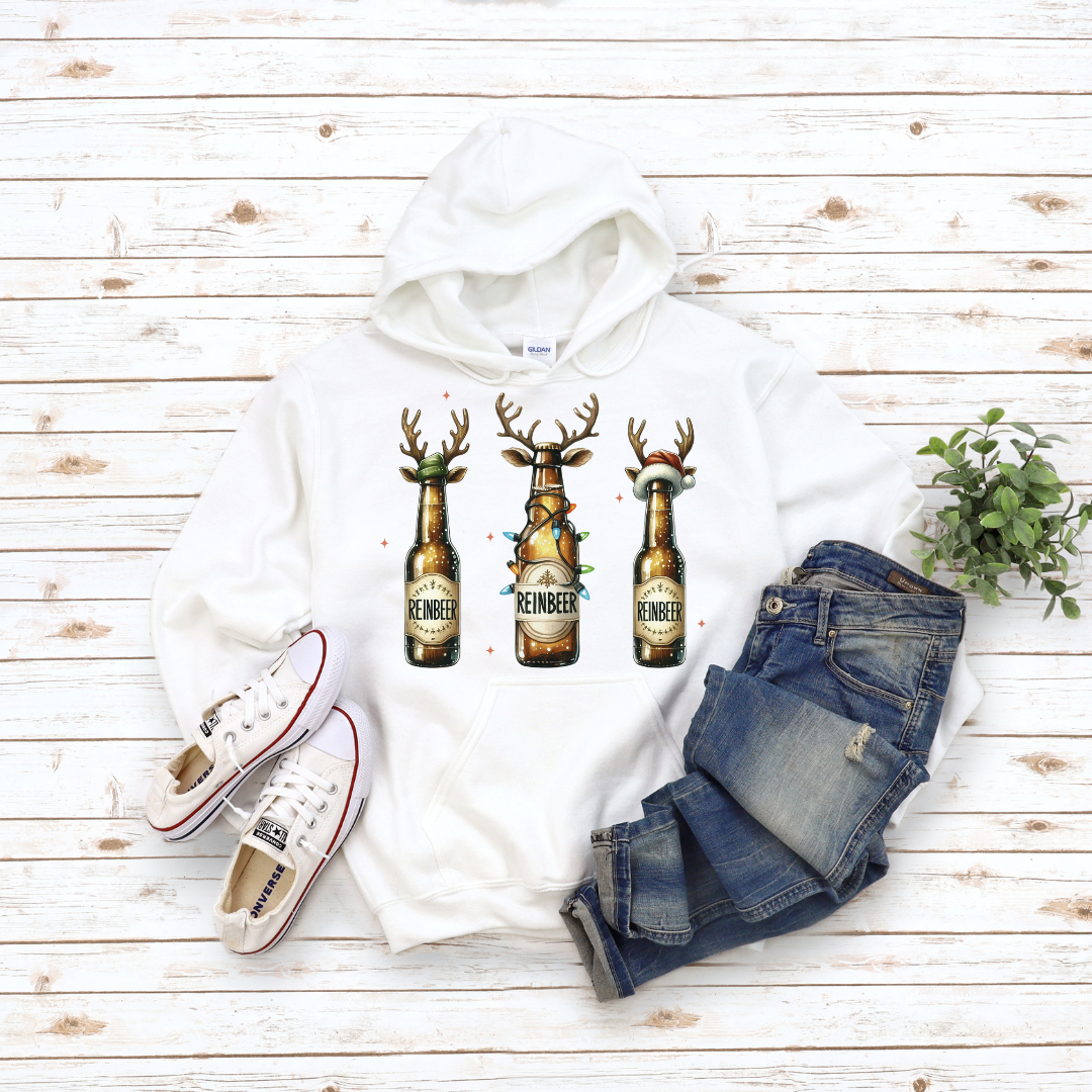 Introducing our Beer Christmas Hoodie, the perfect blend of festive cheer and playful spirit for beer enthusiasts this holiday season! This hoodie features an eye-catching design showcasing a lineup of "Reinbeer" bottles, adorned with holiday flair that’s sure to make everyone smile. It’s the ideal choice for gatherings, parties, or just cozying up with a cold one at home.
