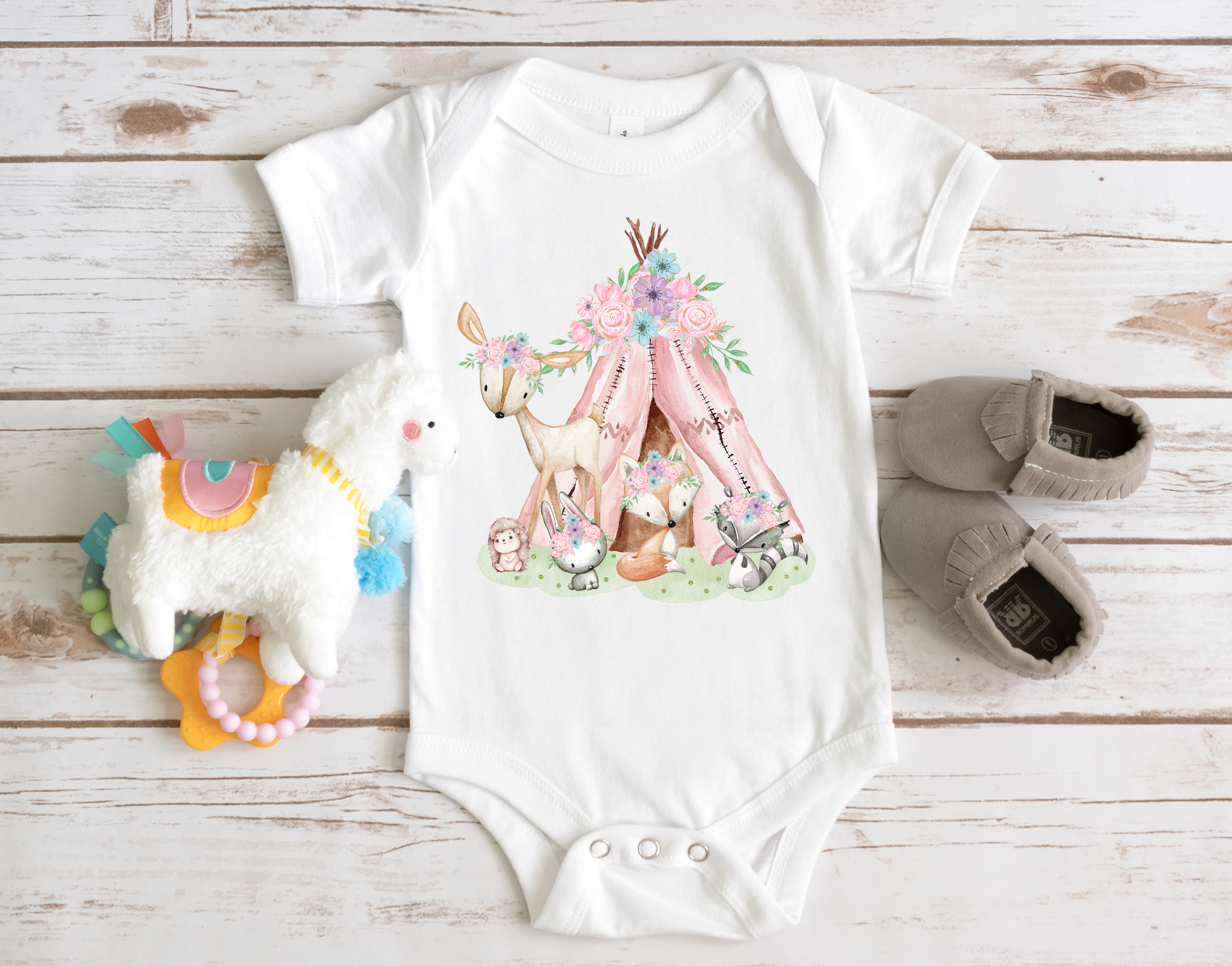 -Charming Design: he t-shirt showcases an adorable collection of forest animals including deer, rabbits, foxes, and owls, set against a lovely pink backdrop, creating a whimsical and captivating look.