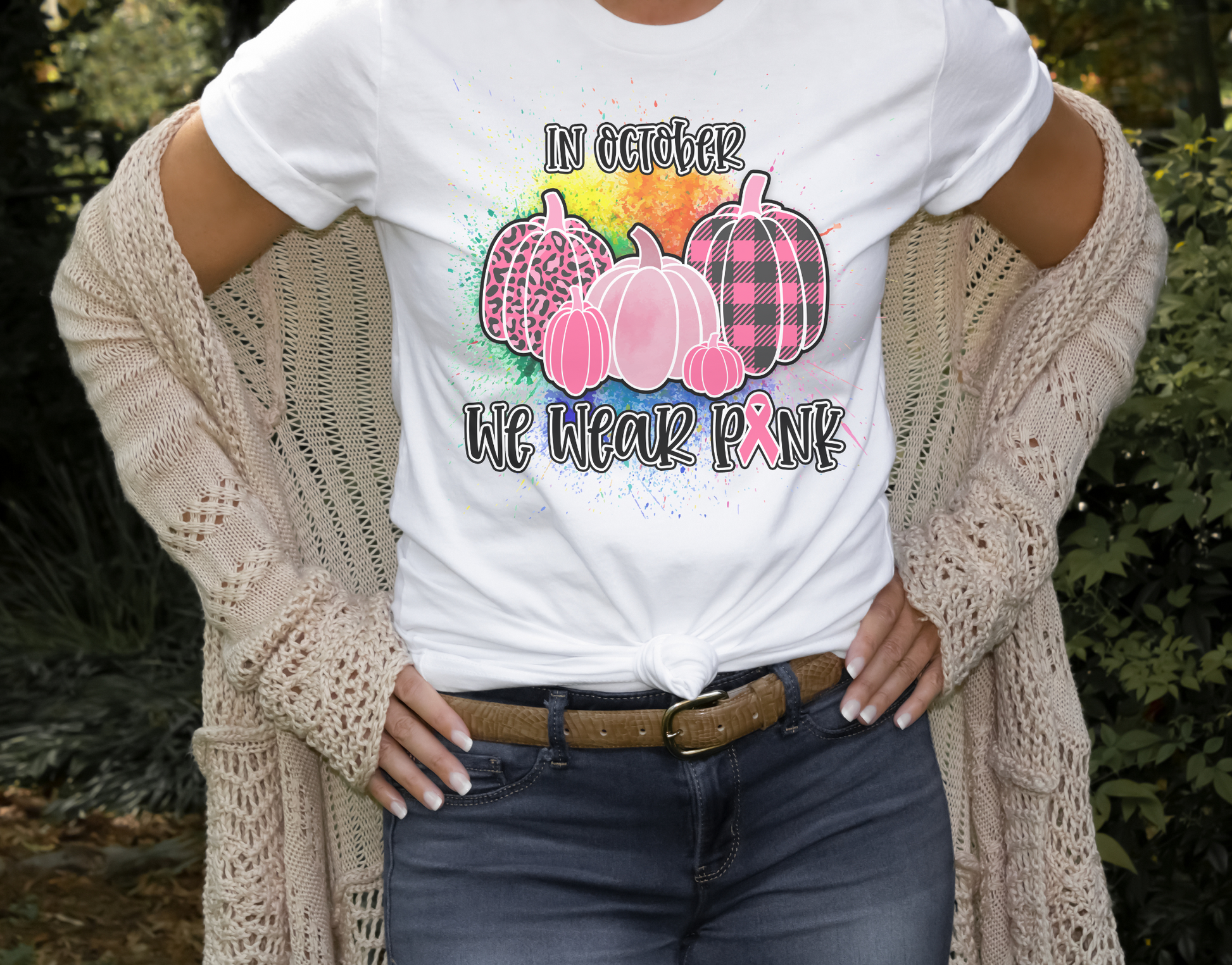 Introducing our In October We Wear Pink Tee, featuring a festive lineup of pink pumpkins in leopard print, plaid, and solid designs. With a colorful splash background and the bold message “In October We Wear Pink”, this tee is the perfect way to show your support for Breast Cancer Awareness while keeping your fall wardrobe stylish and fun.