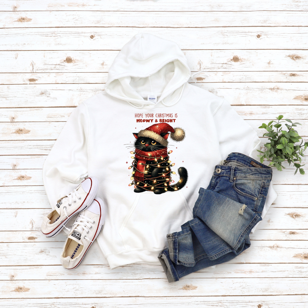 Embrace the holiday cheer with our "Meowy and Bright" Hoodie—the perfect way to wish everyone a joyful and cozy Christmas!