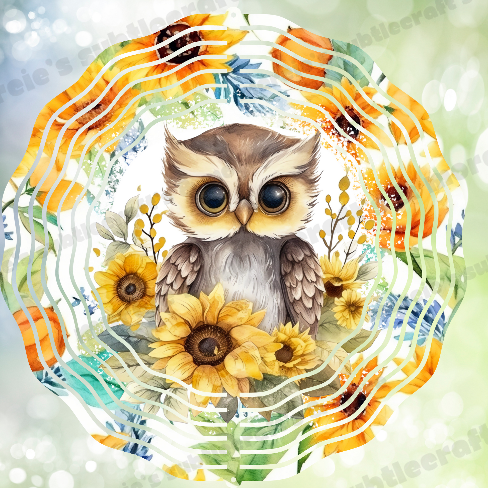 Introducing our charming Owl and Sunflower Wind Spinner – a delightful fusion of nature's beauty and whimsical artistry that adds character and motion to your outdoor haven. Crafted with meticulous attention to detail, this enchanting spinner features a wise owl perched amidst vibrant sunflowers, creating a scene that evokes warmth and joy.