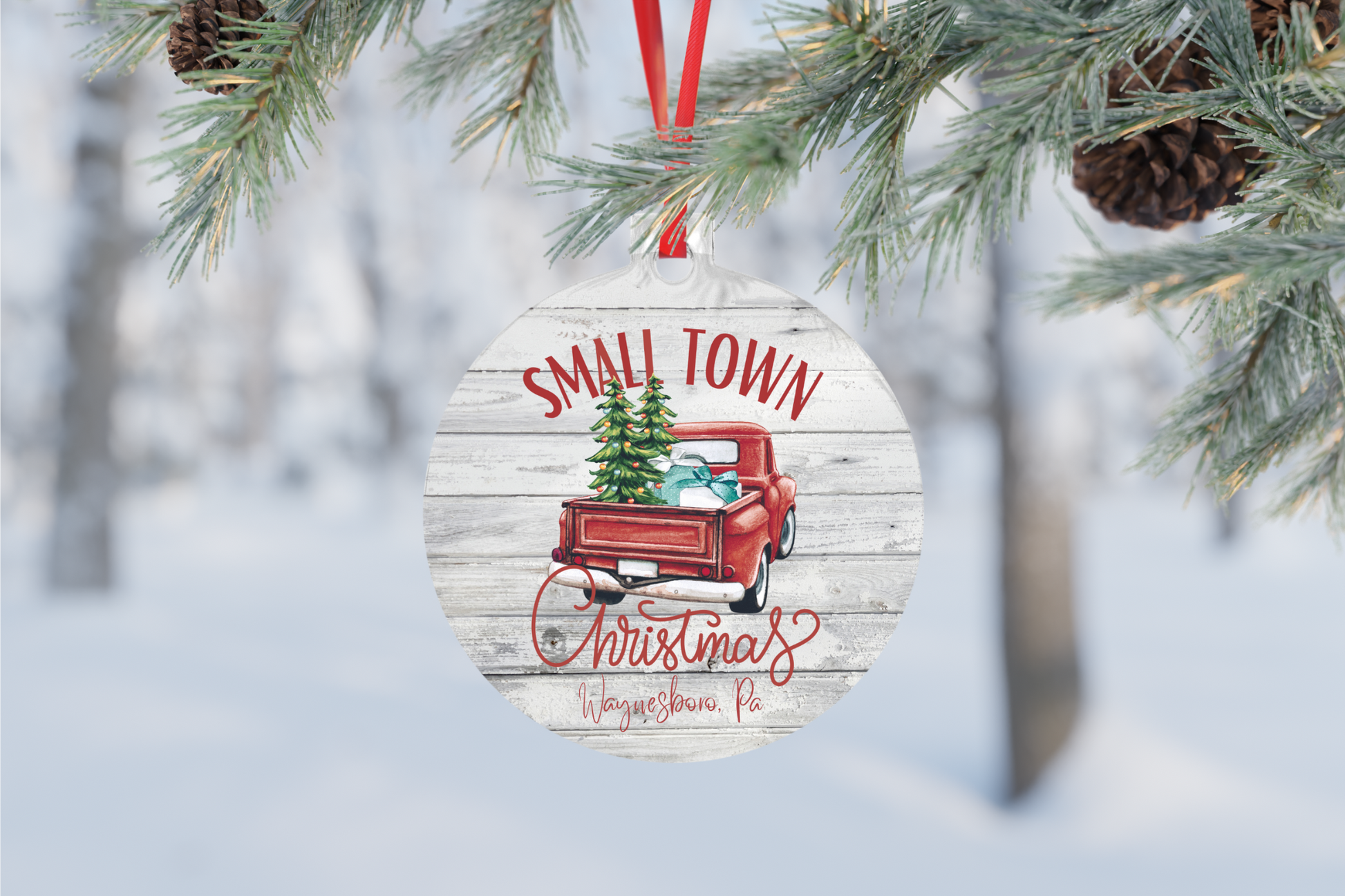 Introducing our Small Town Christmas Ornament, a perfect way to celebrate your love for your small town during the holiday season. This charming ornament features a classic vintage red truck, a symbol of nostalgia and timeless holiday cheer, complete with a customizable small town name to make it truly personal. Whether you’re adding it to your own Christmas tree or gifting it to friends and family, this ornament brings a warm, rustic touch to any holiday decor.
