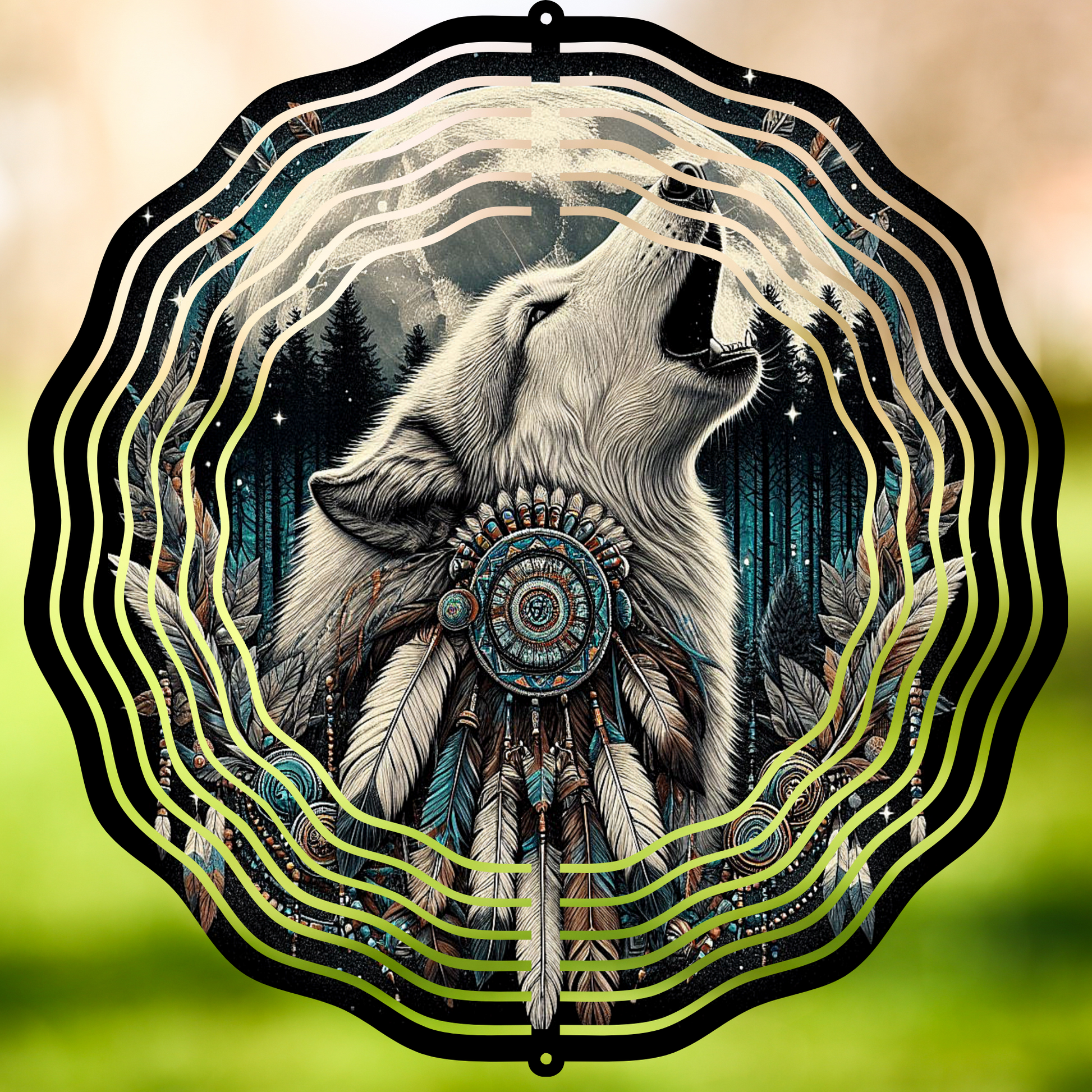 Let your space echo with the call of the wild with our Spirit of the Wild Wind Spinner. Featuring a majestic wolf howling beneath a glowing moon, framed by rich earth tones and Indigenous-inspired patterns, this striking piece blends natural beauty with cultural reverence. As it spins, it tells a story—of freedom, strength, and deep spiritual connection to nature.